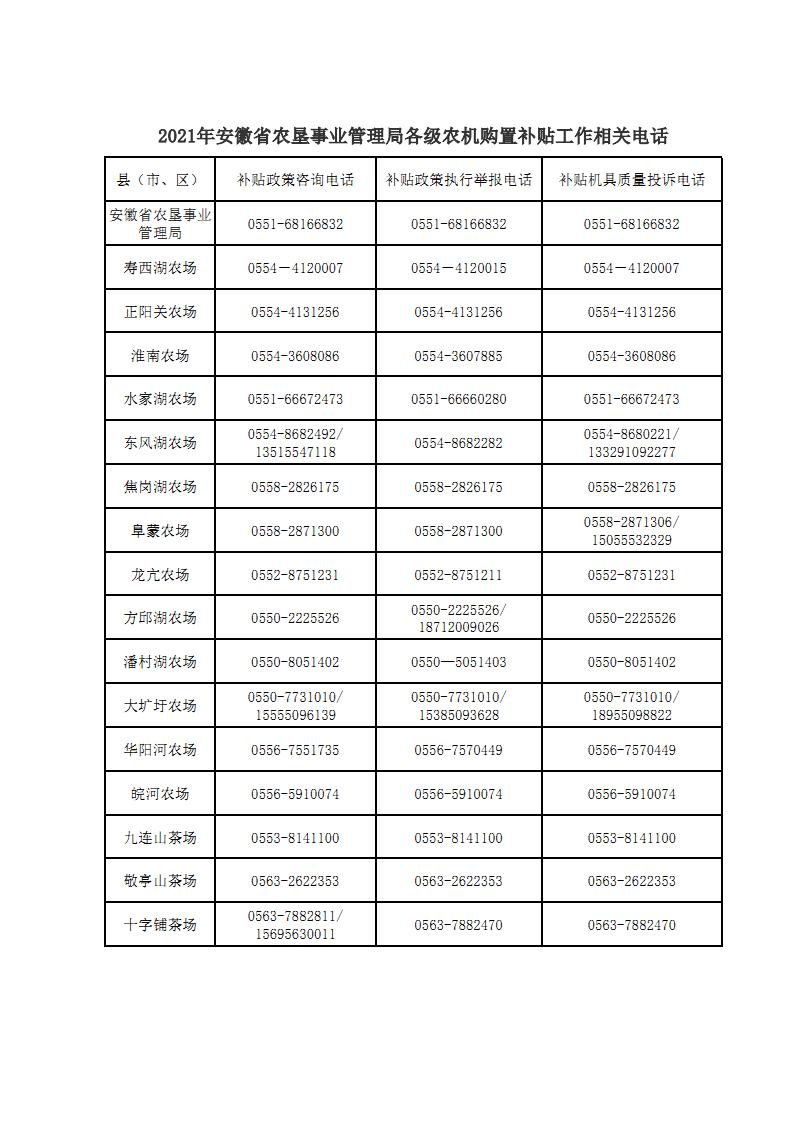 2021年安徽省农垦事业管理局各级农机购置补贴工作相关电话
