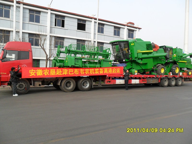 安徽农垦第三批赴津巴布韦农机装备抵达天津即将离港启运,本批物资为10台世界先进品牌约翰迪尔收割机,John Deer 1048型号和 John Deer 1076型号各5台。预计于6月份可抵达津巴布韦皖津农场,按时投入到小麦等作物的收割。(徐曙