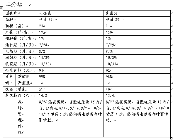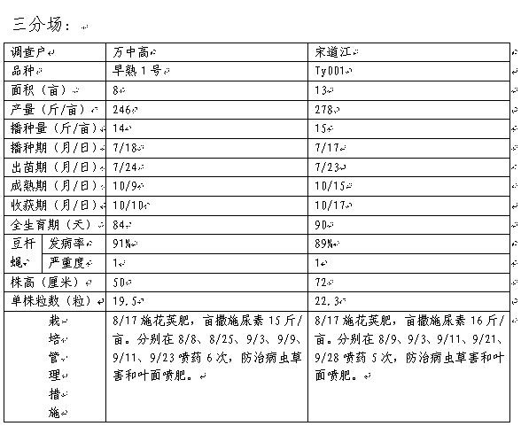 2.由农科所组织2-3名技术人员,定期通过田间观察和职工口述,详细调查补种典型户的生产管理情况和补种大豆生育特点。