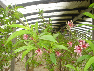 近日,砀山果园场设施大棚内的桃花绽放。在大棚内,该场一分场技术员正在指导职工桃树管理技术。2008年冬全场共罩桃棚20个,品种主要是48油桃,48油桃甘甜爽口,主要销往广州、上海、深圳等大城市的超市,广受消费者的青睐,而且价格不菲。今年虽受金融危机影响,行情也应该看好。