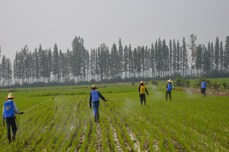 连日来,大圹圩农场农业二管区,职工农事队正在田间施药防治病虫害。受近日持续阴雨天气影响,场区水稻受到禾本科杂草、灰飞虱等病虫草害侵袭。场农技专家深入田间调查农情,开出施药处方,指导职工适时防治、加码夏管。