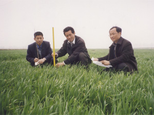 龙亢农场全力实施人才强场战略,依靠事业聚人,待 遇引人,政策留人,环境造就人,目前在农场工作的 168名高校毕业生,有49人担任农场场长、部长、经 理等重要领导岗位,有98人从事专业技术工作。图 为高级农艺师许化武(右)带领两名农业本科生在 研究小区小麦品种长势。