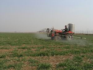 进入3月份以来,潘村湖农场广大职工家庭农场不失 时机地做好小麦田管工作,为今年午季再获丰收夯 实基础。图为种子公司原种场职工正在实施田间喷 药场景。(杨登宏摄)