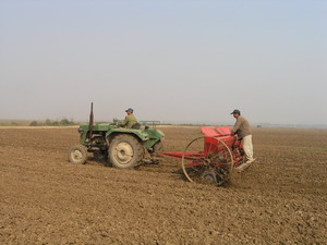 从10月16日开始,潘村湖农场掀起了秋种高潮,当天 播种小麦6000余亩.预计全场秋种在本月20日前结 束.图为一分场宗胜宽家庭农场正在播种小麦的情 景.(杨登宏)