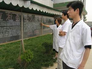 潘村湖农场职工医院于近日在全院开展了树立社 会主义荣辱观教育活动。该院通过召开会议、科室 讨论和宣传栏等形式大力宣传胡锦涛总书记倡导的 “八荣八耻”,教育全体员工牢固树立全心全意为 患者服务思想,开展争先创优竞赛活动,取得了良 好效果。图为医院工作人员正在宣传栏前学习讨论 社会主义荣辱观宣传内容。(杨登宏摄)